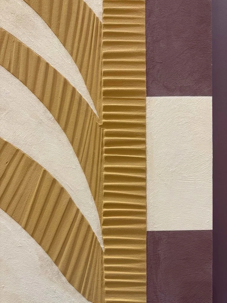 The mural serves as a vibrant interpretation of natural energy oscillation, featuring bold, rhythmic stripes in earthy tones intertwined with organic leaves made from mineral plaster and copper. This design aims to create a serene atmosphere, blurring the lines between indoor and outdoor experiences.